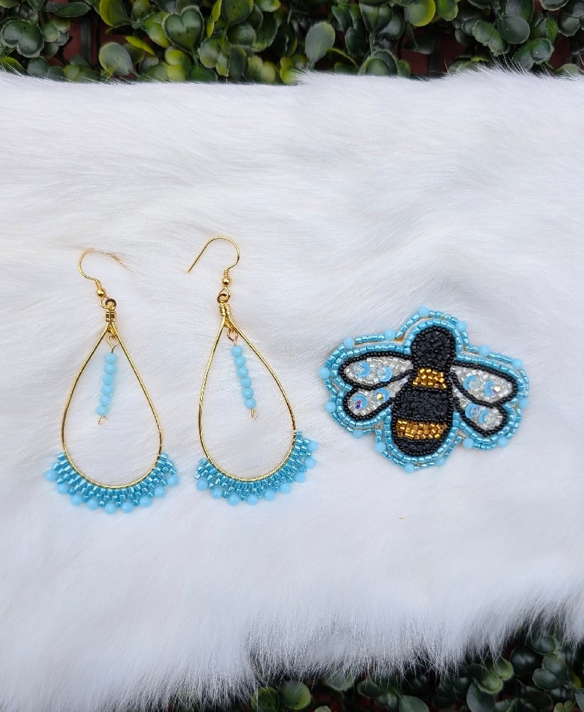 Bee pin with cylin beads, sequins, bicones and 3 cuts. Lined with 15s and backed with leather