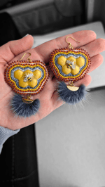 Clay cab with cute bumblebee charm. Backed with leather and finished with a mink fur drop. Beaded with delicas