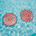 Cute little fishes beaded on real fish leather. 18k gold plated wire guards and hooks, edged with beautiful teal colored bicones and backed with white faux leatherette