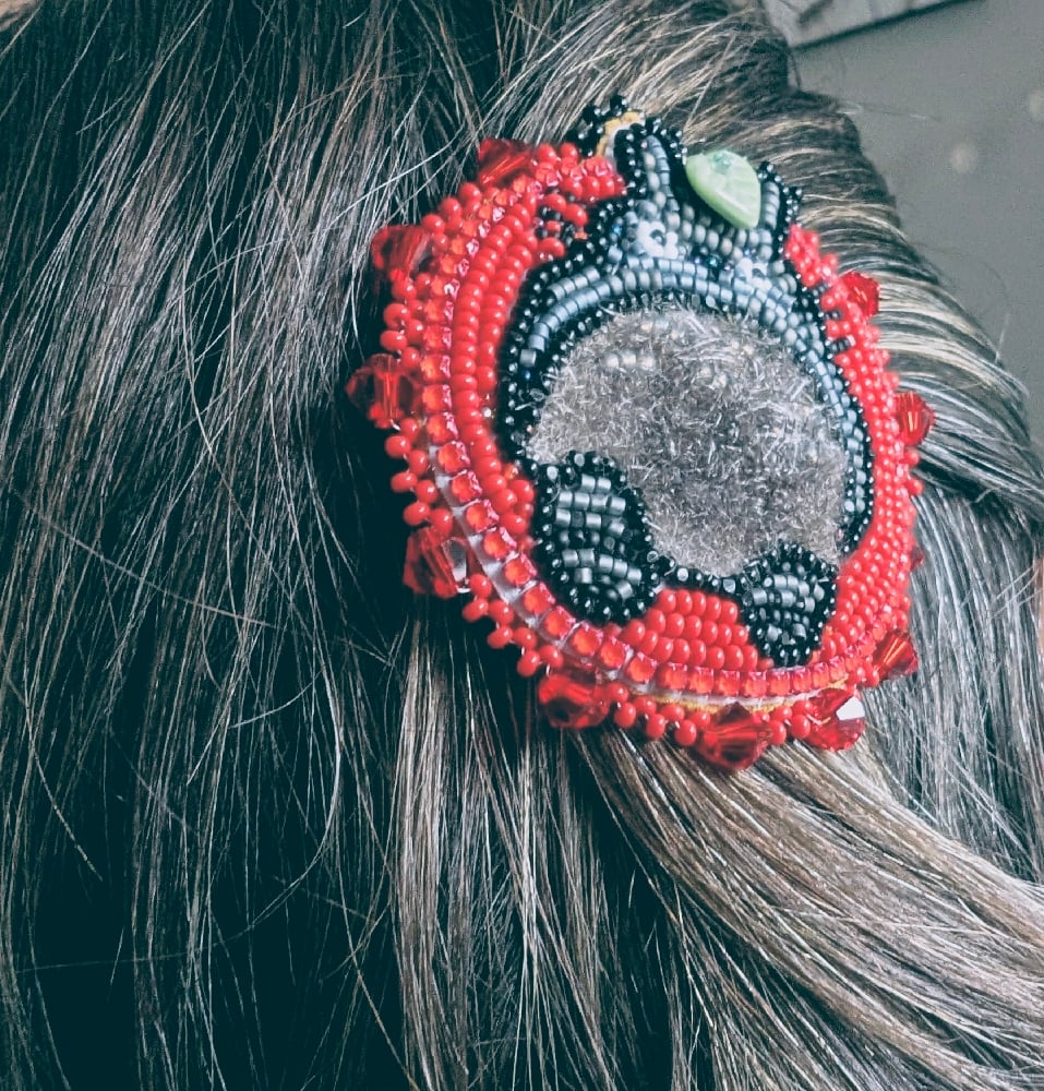 My neighbour Totoro barette features delica beads, a seal skin belly and backed with deer hide.